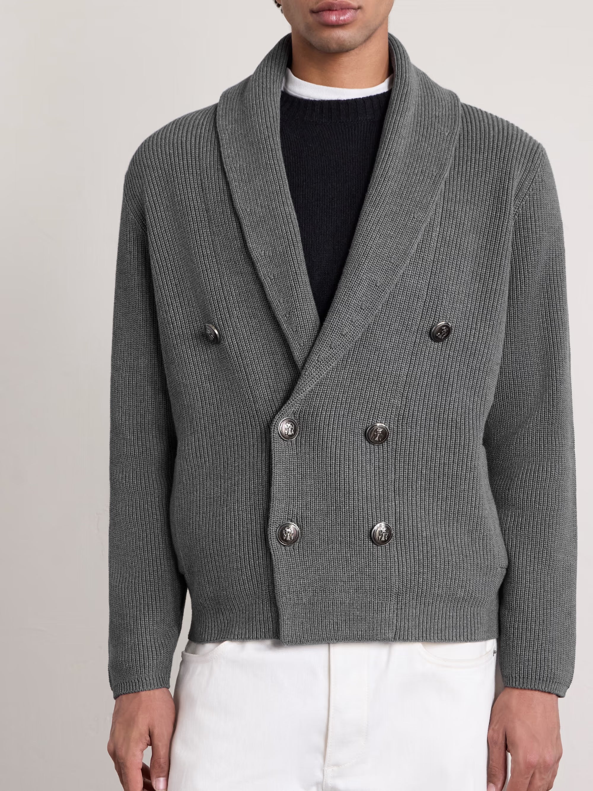 Brunello Cucinelli's cardigan exemplifies the relaxed elegance of Italian style. It's knitted from breathable cotton using a thick, ribbed stitch for texture and has double-breasted front and shawl collar. The buttons are engraved with the label's crest.