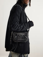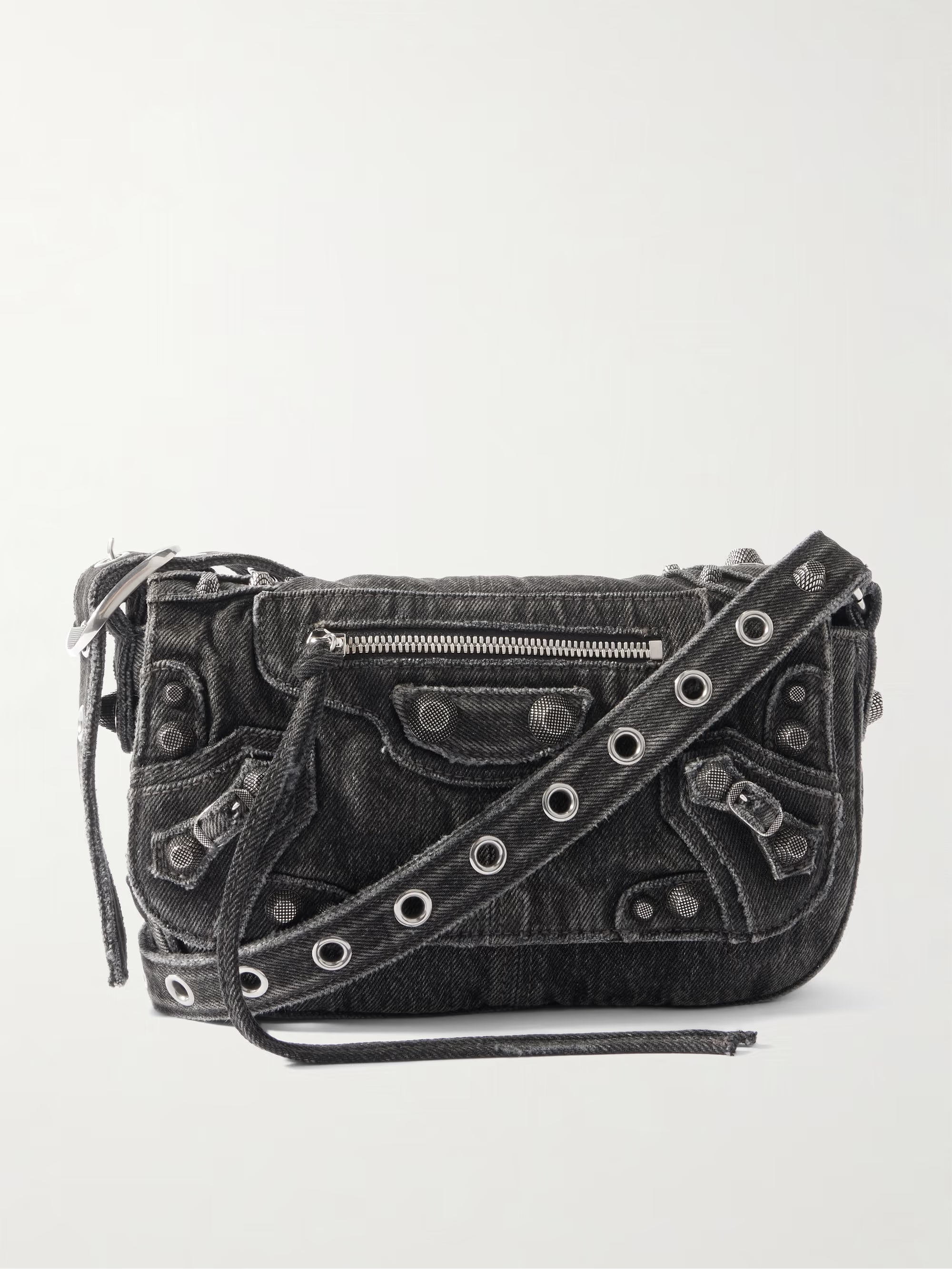 Balenciaga's iconic 'Le Cagole' range is defined by aged silver-tone studs and grommets. This 'XS' messenger bag has been made in Italy from washed-denim and features zipped pockets at the front and back to tuck your cards and ear buds.
